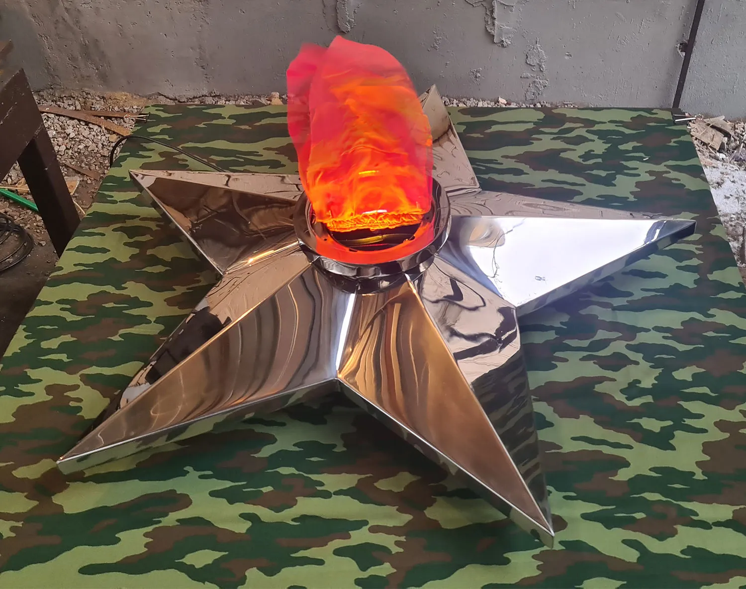 Конструкция вечного огня изготавливается из тонколистовой нержавейки, полируется и покрывается нитридом титана в цвет золота.