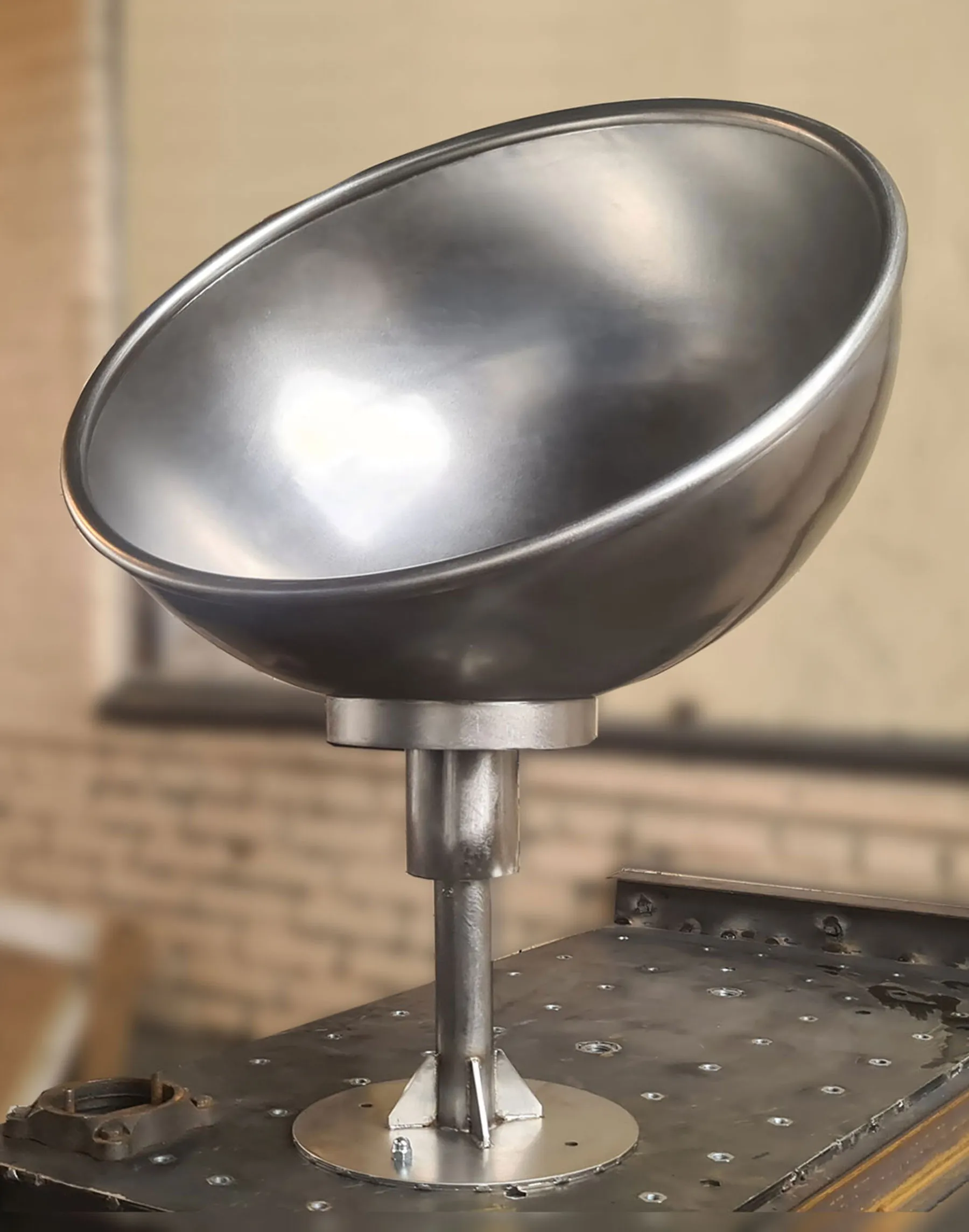 Полусфера – карусель (поворотная платформа) из нержавеющей стали AISI304, толщина листа 3 миллиметра. Вращающееся кресло – это великолепная модель изделия на детскую игровую площадку. Стальной корпус полусферы способен выдержать вес до 350 килограмм. В основание – стойку изделия встроен прецизионный поворотный механизм на радиально-опорных подшипниках. Возможная персонализация - лазерная гравировка на корпусе изделия.